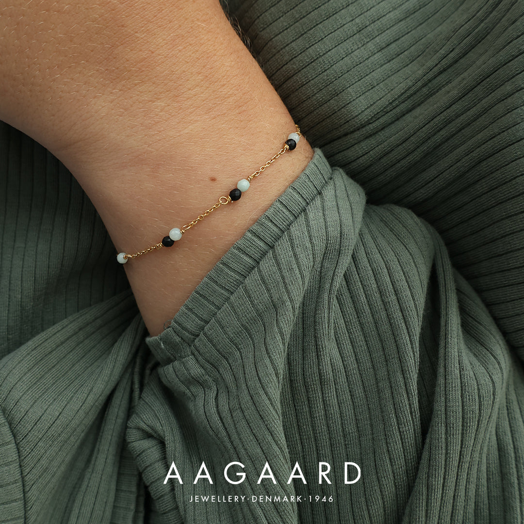 Forvæn dig selv med vores forgyldte armbånd fra Aagaard, udført i 18 karats pragt. Dette eksklusive smykke er indgraveret med sorte onyx- og grønne amazonitesten, som symboliserer styrke og harmoni. Den forgyldte finish tilføjer en subtil elegance til ethvert outfit. Med sin unikke kombination af ædelstene og ædle metaller, er dette armbånd en fejring af tidløs skønhed og udsøgt håndværk. Bær det som et smykke med personlighed og stil, der passer perfekt til enhver lejlighed. Gør et uforglemmeligt indtryk med dette strålende armbånd fra Aagaard, der emmer af elegance og raffinement. Længde 14,5-21 cm.