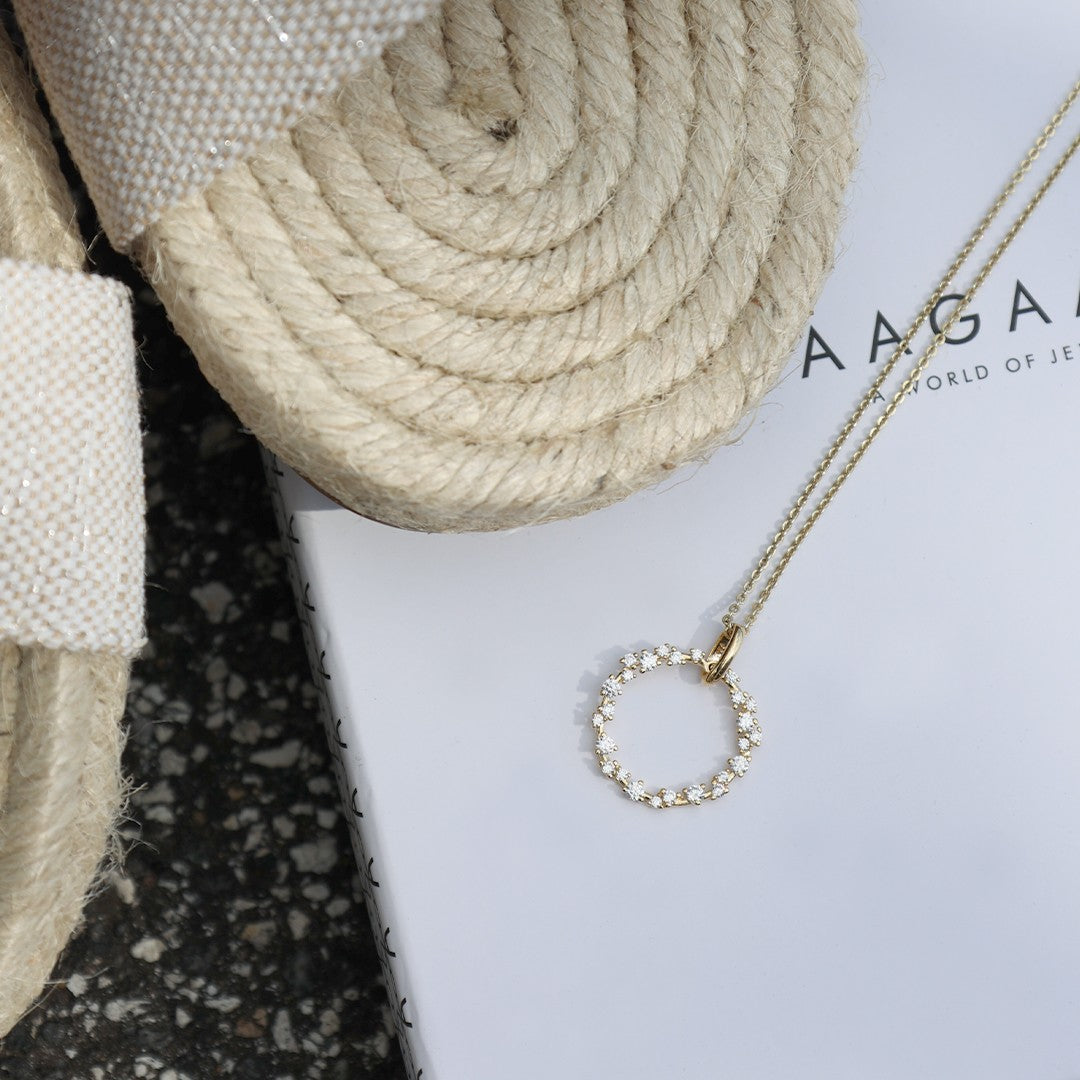 Skab en strålende aura med vores 18 karats forgyldte cirkelformede vedhæng, smukt prydet med glitrende cubic zirconia sten hele vejen rundt. Dette enestående smykke fra Aagaard fusionerer luksus og elegance og er den ultimative accessory til enhver anledning. Det forgyldte design tilføjer en sublim glød, der fanger lyset på betagende vis. Hvert vedhæng er omhyggeligt fremstillet med topkvalitetsmaterialer for at sikre langvarig glans og slidstyrke. Med sit unikke design og uovertruffen kvalitet vil dette vedhæng med cubic zirconia sten blive et højt skattet smykke i din kollektion. Erhverv det i dag og tilføj et strejf af overdådig stil til dit look. Med 45 cm forgyldt kæde.