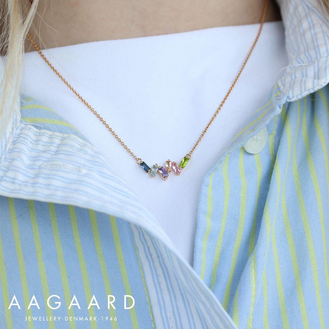 Oplev en strålende fusion af elegance og farver med vores 18 karats forgyldte vedhæng, smykket med en regnbue af skinnende ædelstene. Dette eksklusive smykke er en fejring af skønhed og harmoni og er det perfekte supplement til enhver beklædningsstil. Ædelstenenes varierende farver danser smukt mod den forgyldte base og skaber et mesterværk af uovertruffen skønhed. Hvert vedhæng fra Aagaard er omhyggeligt håndlavet med præcision og dedikation, hvilket gør det til en skat, der varer livet ud. Bær det med stolthed og lad dets regnbuepragt lyse op i din verden. Anskaf dig dette unikke vedhæng nu for at tilføre en strålende dimension til din personlige stil. Med 45 cm forgyldt kæde.