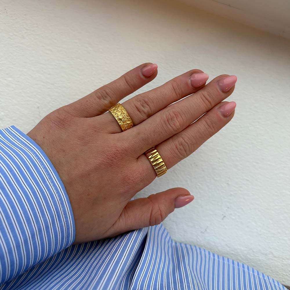 Forvæn dig selv med en strålende skønhed - Aagaard's 18 karats forgyldte fingerring med subtile riller. Denne enestående ring forener luksus og originalitet på smukkeste vis. Håndværket bag denne ring er en hyldest til Aagaard's ekspertise og passion for detaljer. Den forgyldte finish tilfører et eksklusivt strejf til ethvert look, og gør denne ring til et tidløst mesterværk. Bær den som et symbol på både elegance og raffinement. Opdag en ny dimension af skønhed med denne Aagaard fingerring - en uovertruffen juvel, skabt til at blive beundret og elsket.