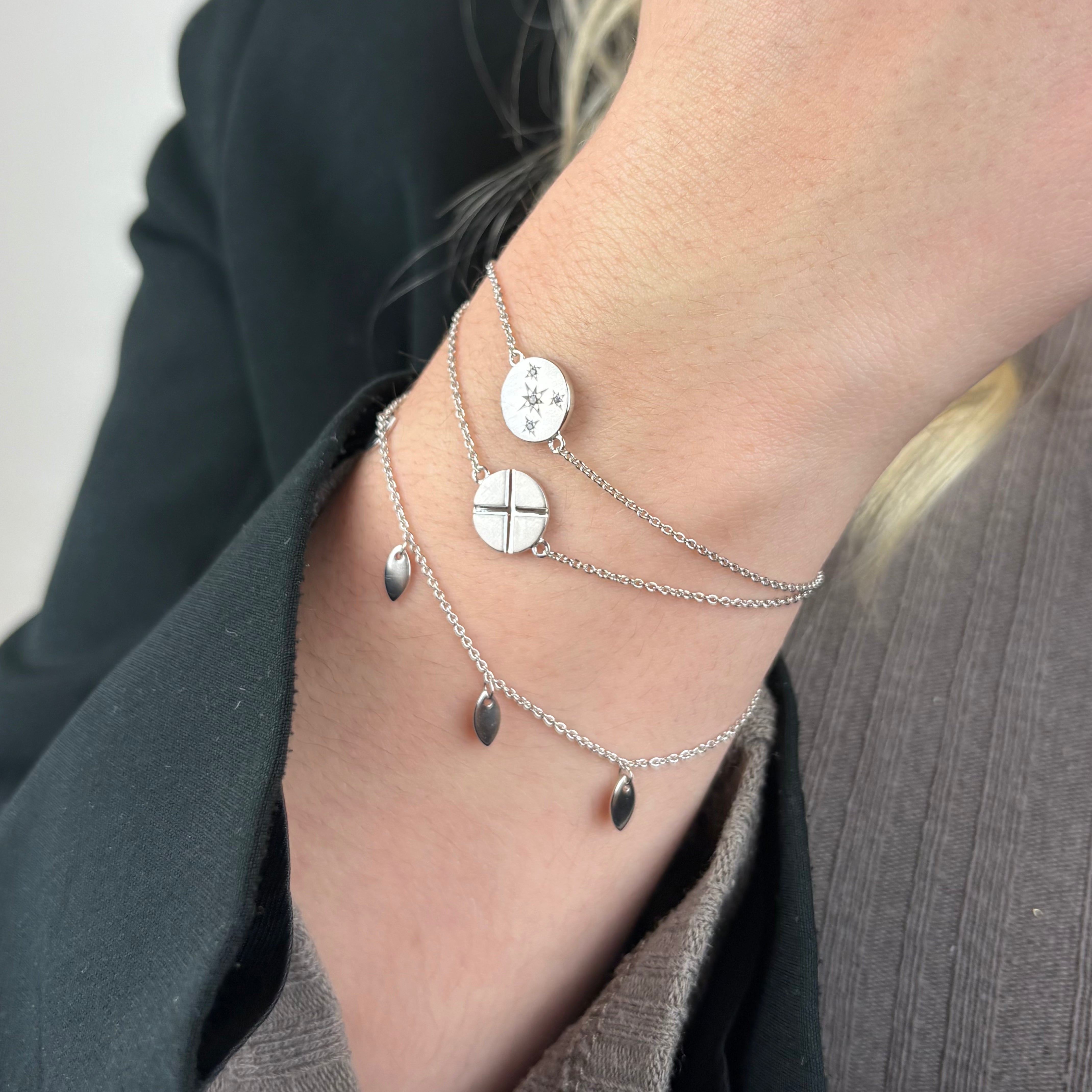AAGAARDs sølvarmbånd med kryds på den let bøjet og runde plade er et elegant smykke med både symbolsk og æstetisk dybde. Det enkle kryds skaber en stærk visuel kontrast på den runde plade.