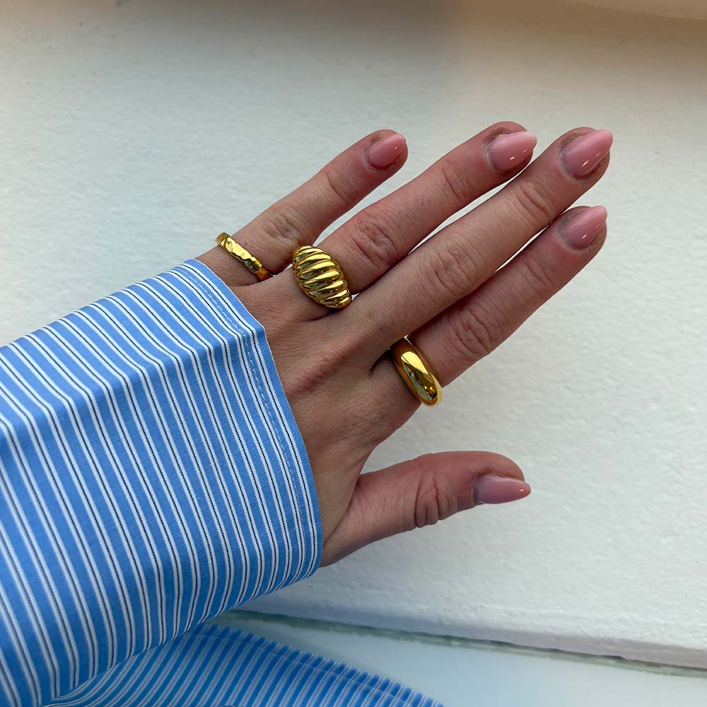 Minimalistisk, blød og legende - vores Doughnut ring i forgyldt 925 sterling sølv er inspireret af de runde, organiske former, vi elsker at røre ved. Den brede, polerede overflade giver et eksklusivt men samtidig uformelt udtryk, der gør ringen perfekt til både hverdag og fest.