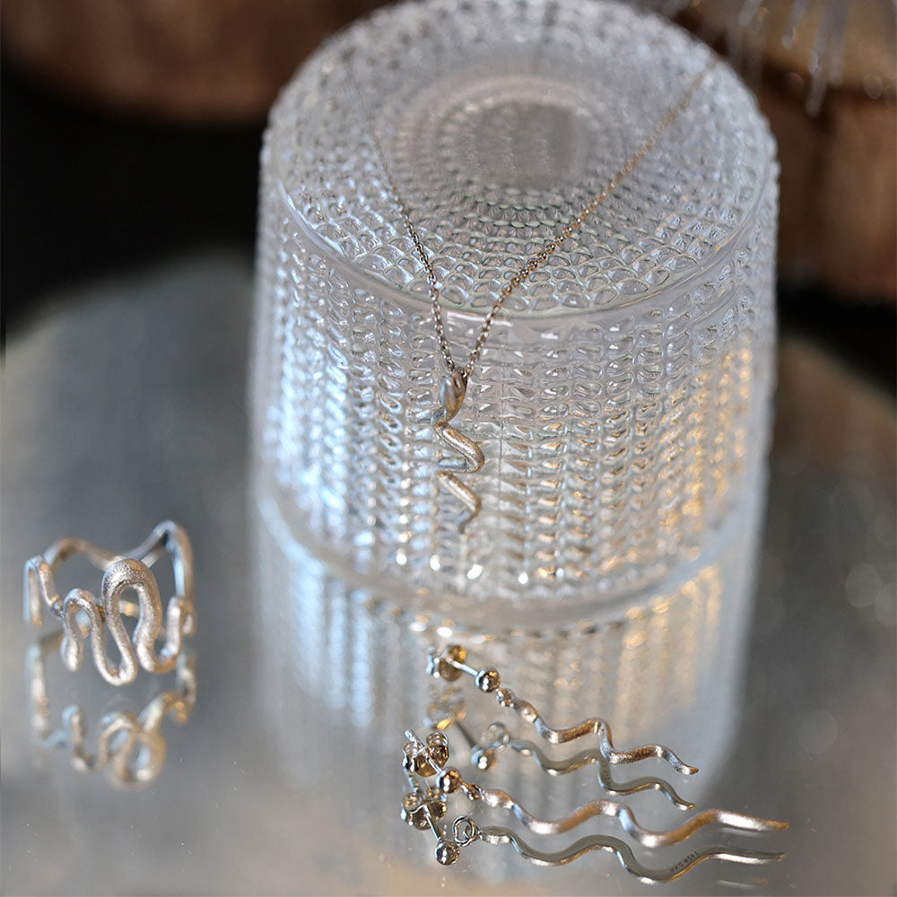 AAGAARDs sølvsmykke formet som en slange bærer på både mystik og symbolik. Slangen har gennem historien været et stærkt symbol i mange kulturer, hvor den repræsenterer transformation, visdom og fornyelse, blandt andet på grund af dens evne til at skifte ham. Det snoede design udstråler elegance og bevægelse, mens den glatte overflade giver smykket et minimalistisk og raffineret udtryk.