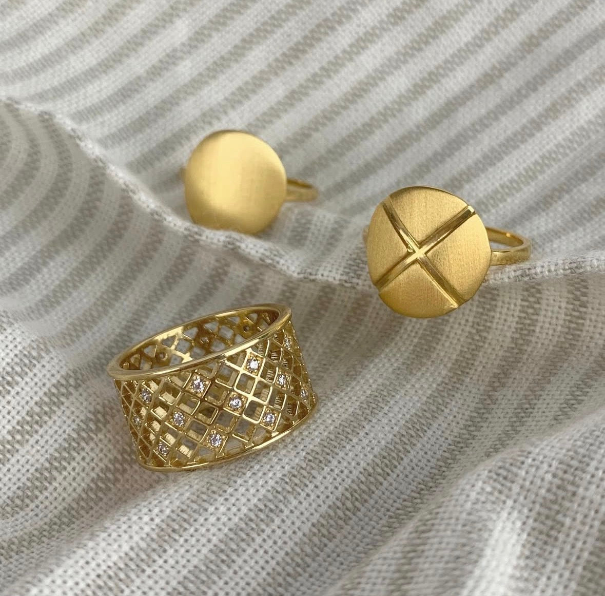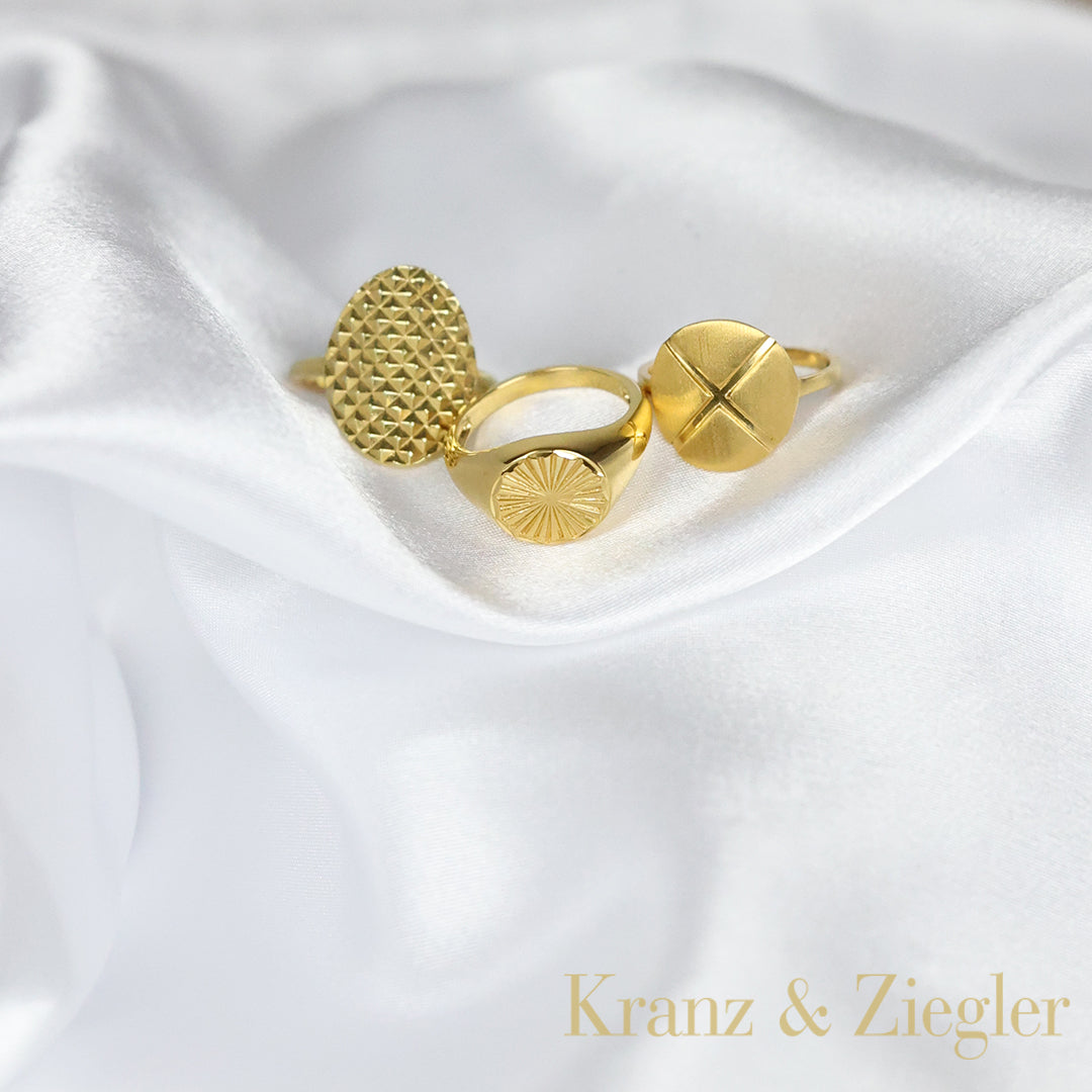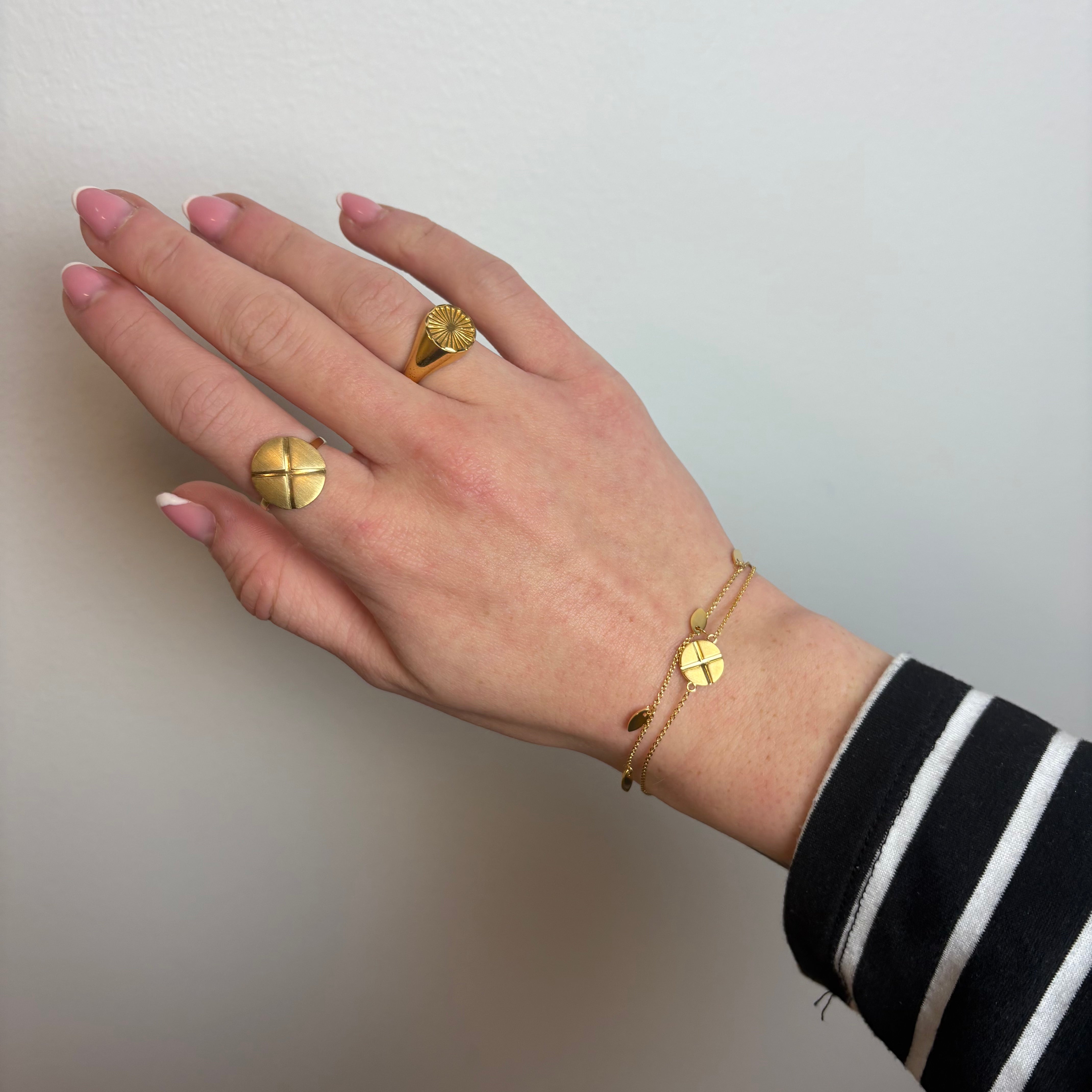 AAGAARDs forgyldte sølvring med kryds på den let bøjet og runde plade er et elegant smykke med både symbolsk og æstetisk dybde. Den forgyldte overflade giver ringen en varm og luksuriøs glød, mens det enkel kryds skaber en stærk visuel kontrast på den runde plade.