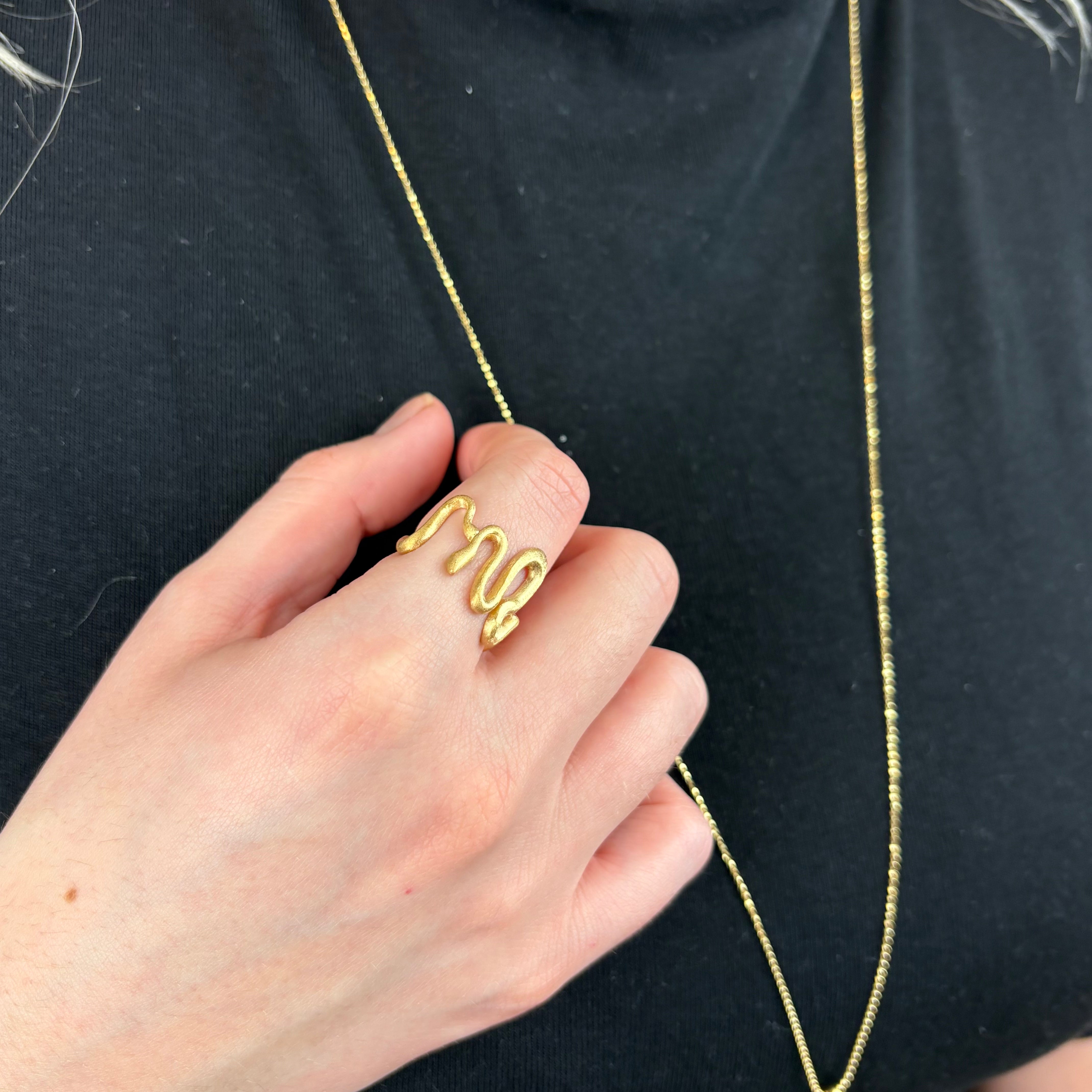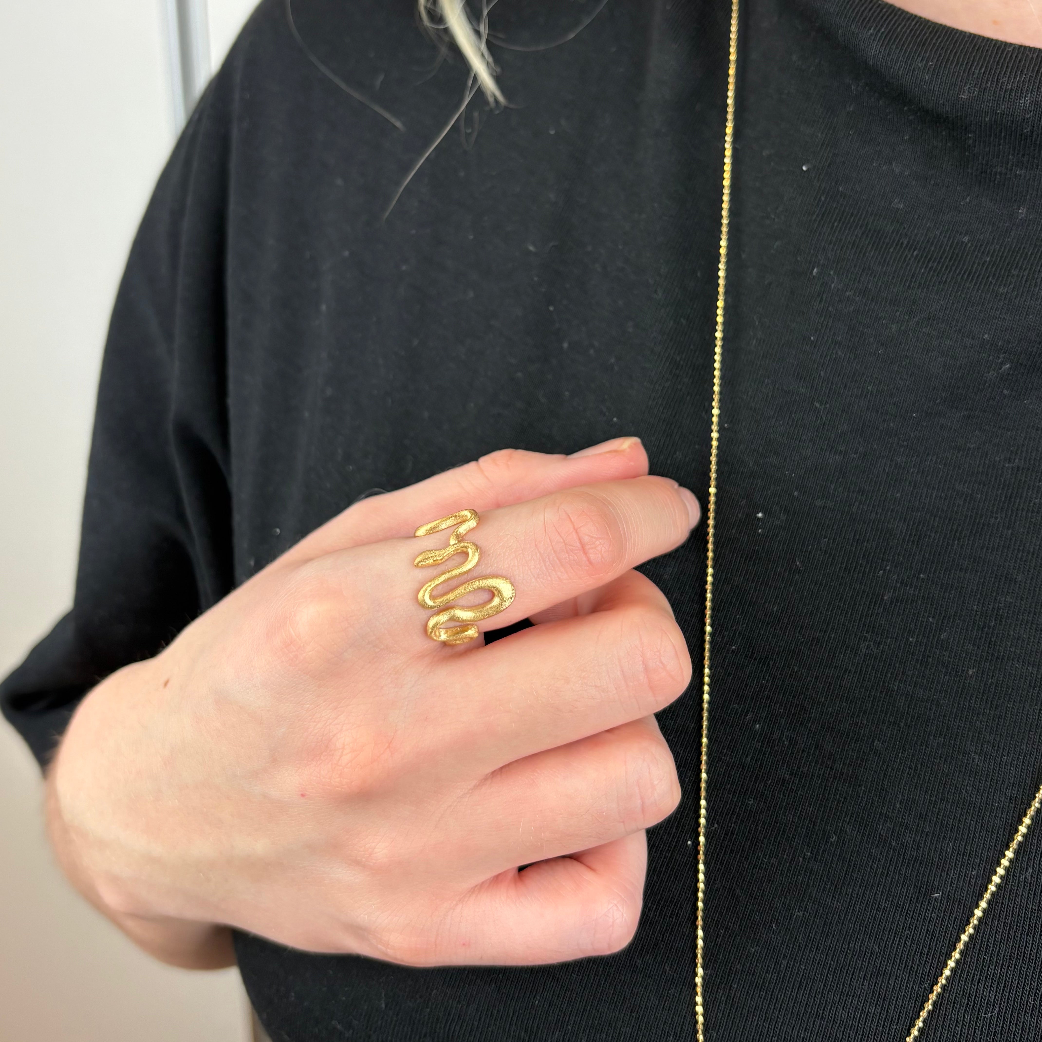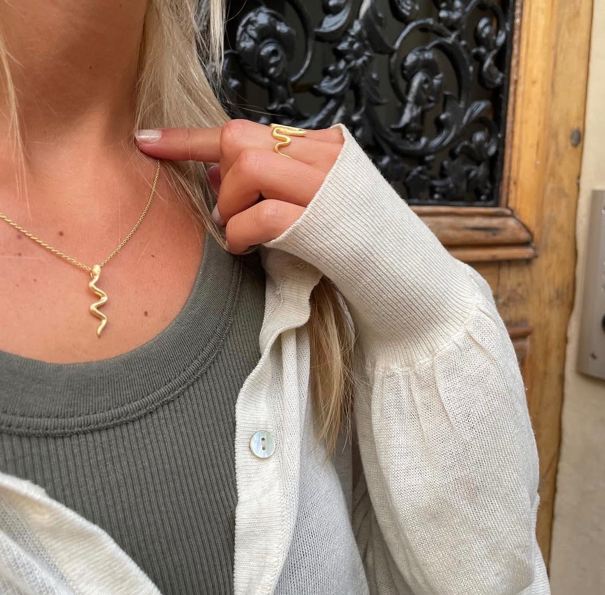 AAGAARDs forgyldte sølvring formet som en slange bærer både mystik og symbolik. Slangen har gennem historien været et stærkt symbol i mange kulturer, hvor den repræsenterer transformation, visdom og fornyelse, blandt andet på grund af dens evne til at skifte ham. Det snoede design udstråler elegance og bevægelse, mens den forgyldte overflade tilfører et strejf af luksus og varme.