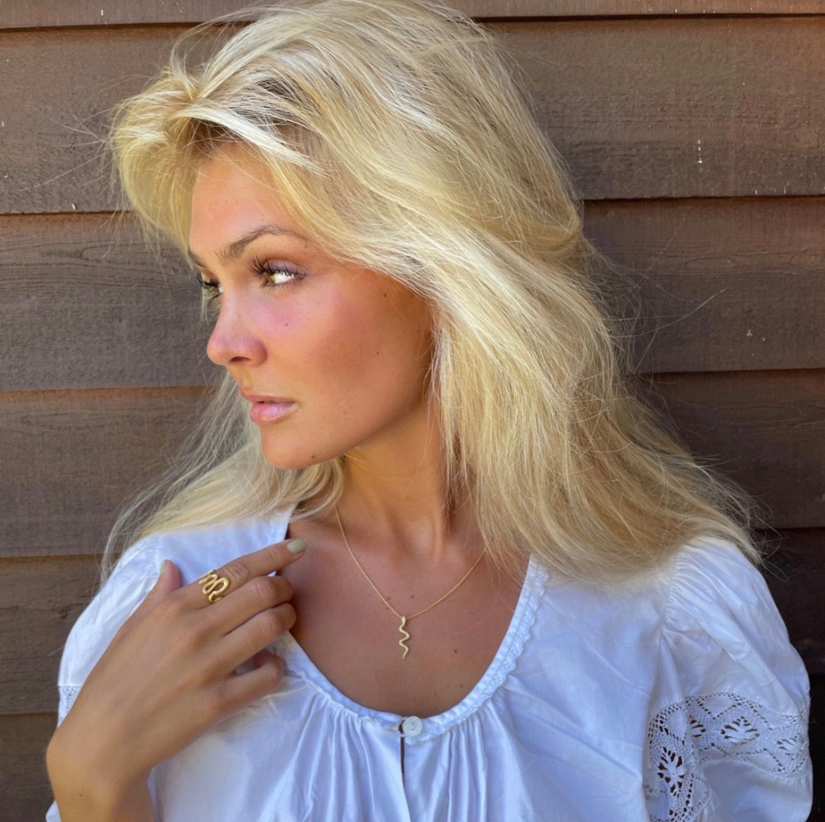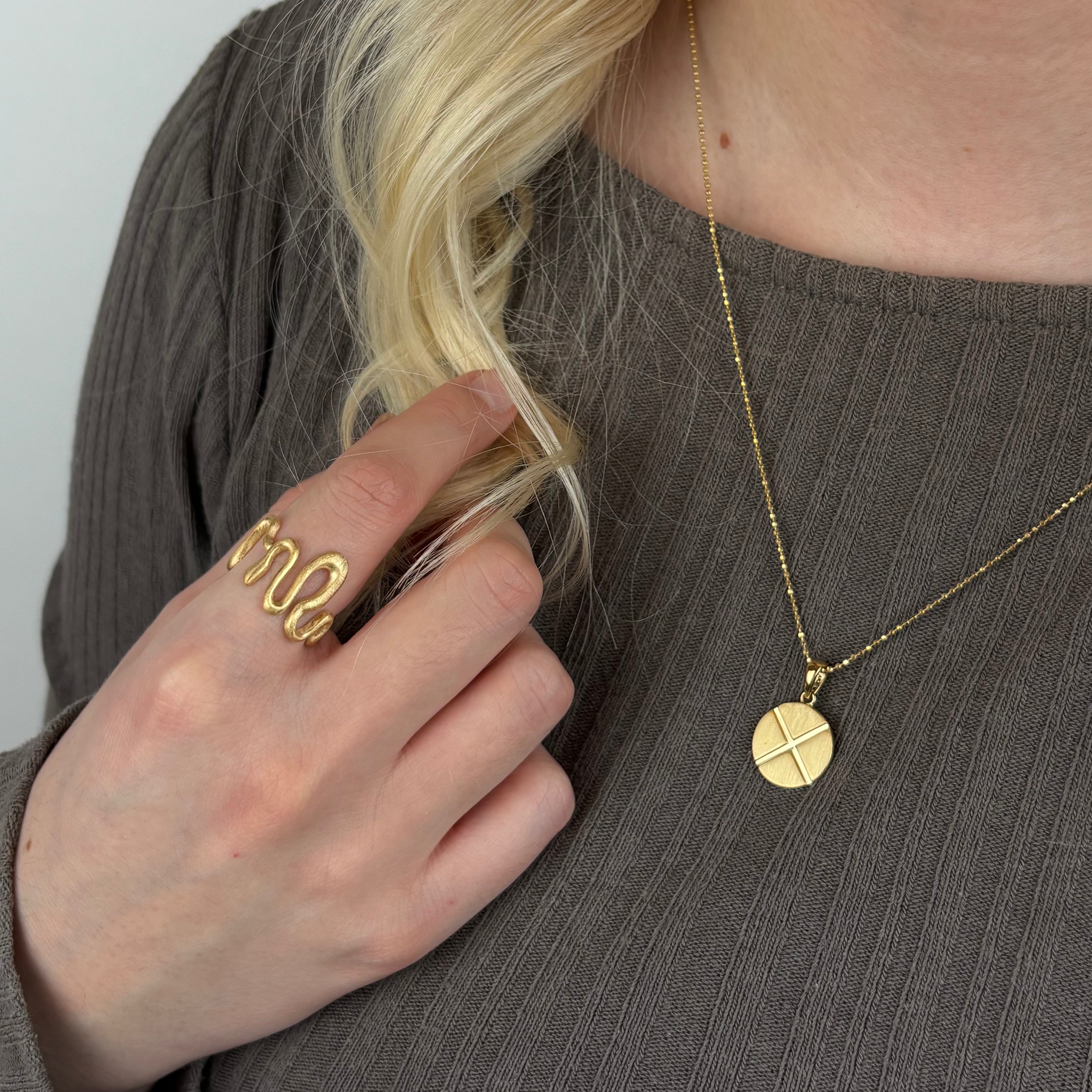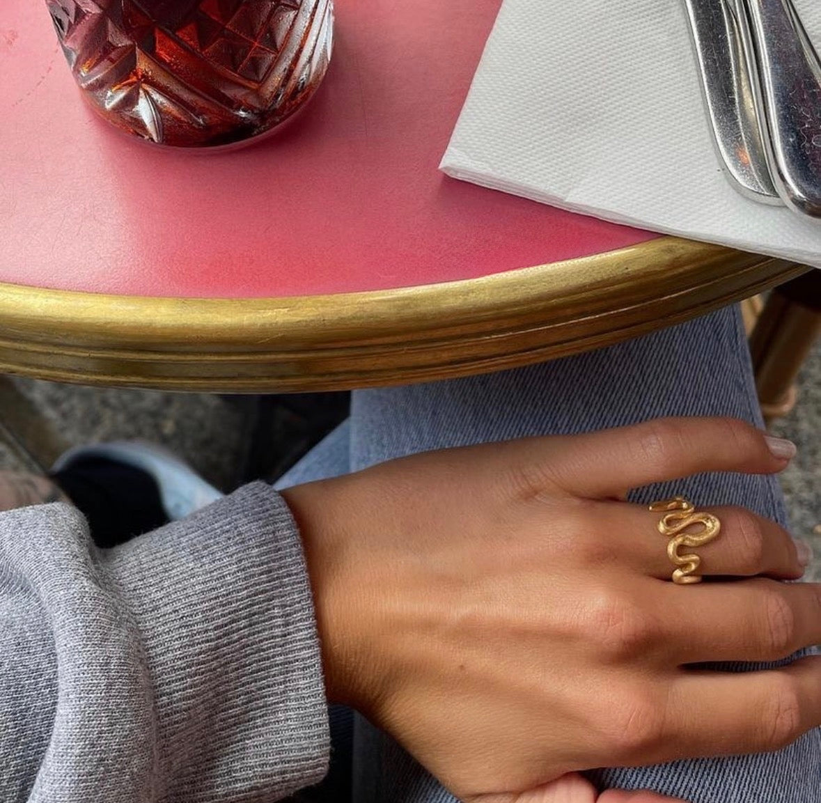 AAGAARDs forgyldte sølvring formet som en slange bærer både mystik og symbolik. Slangen har gennem historien været et stærkt symbol i mange kulturer, hvor den repræsenterer transformation, visdom og fornyelse, blandt andet på grund af dens evne til at skifte ham. Det snoede design udstråler elegance og bevægelse, mens den forgyldte overflade tilfører et strejf af luksus og varme.