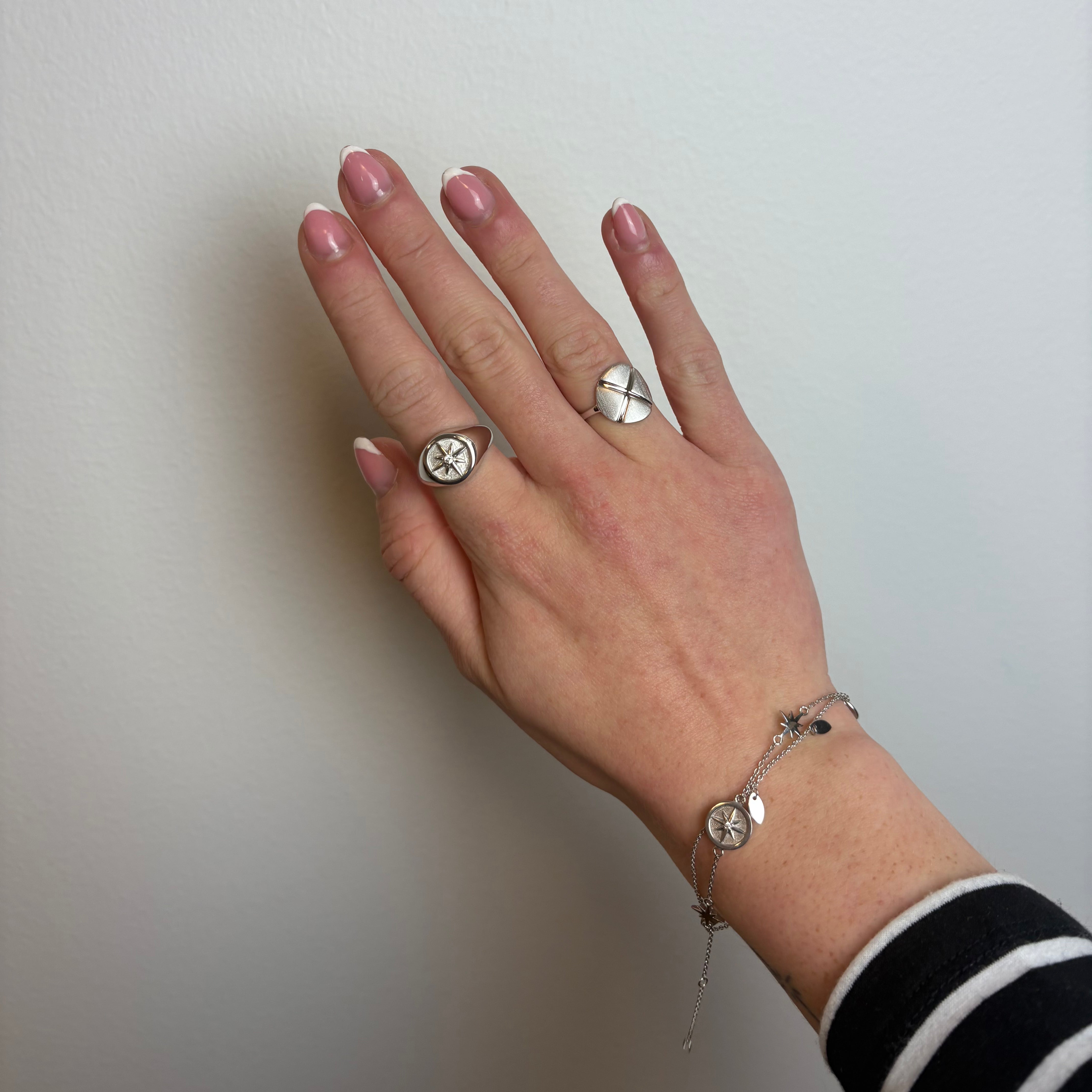 AAGAARDs sølvring med kryds på den let bøjet og runde plade er et elegant smykke med både symbolsk og æstetisk dybde. Det enkel kryds skaber en stærk visuel kontrast på den runde plade.