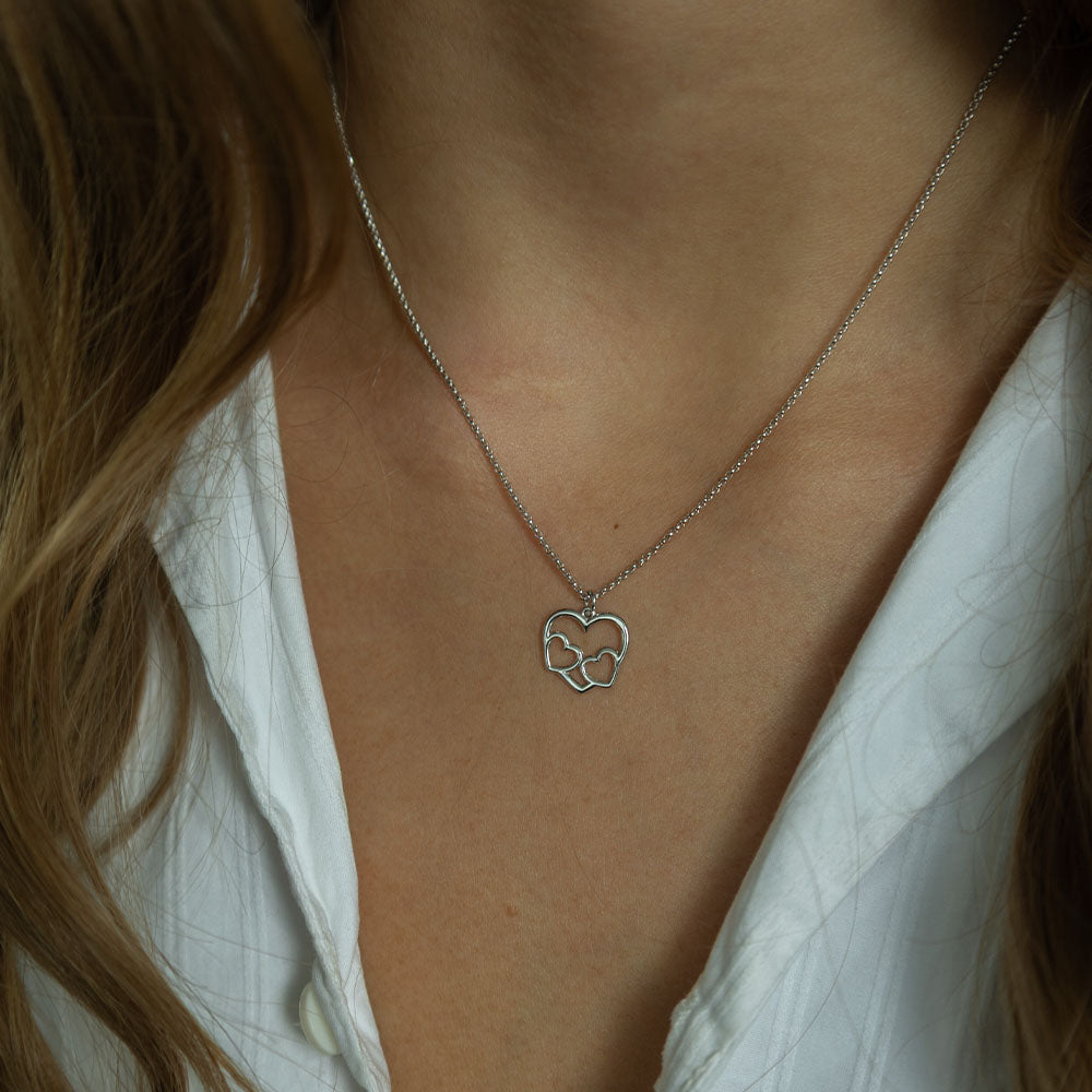 De tre hjerter danner et motiv, der næsten føles levende: ét stort, der rummer og beskytter, og to små, der hviler med tillid og nærhed. Ved hver bevægelse fanger hjertet lyset og sender små glimt af sølv ud, som om det fortæller sin egen stille historie om kærlighed, familie og fællesskab.