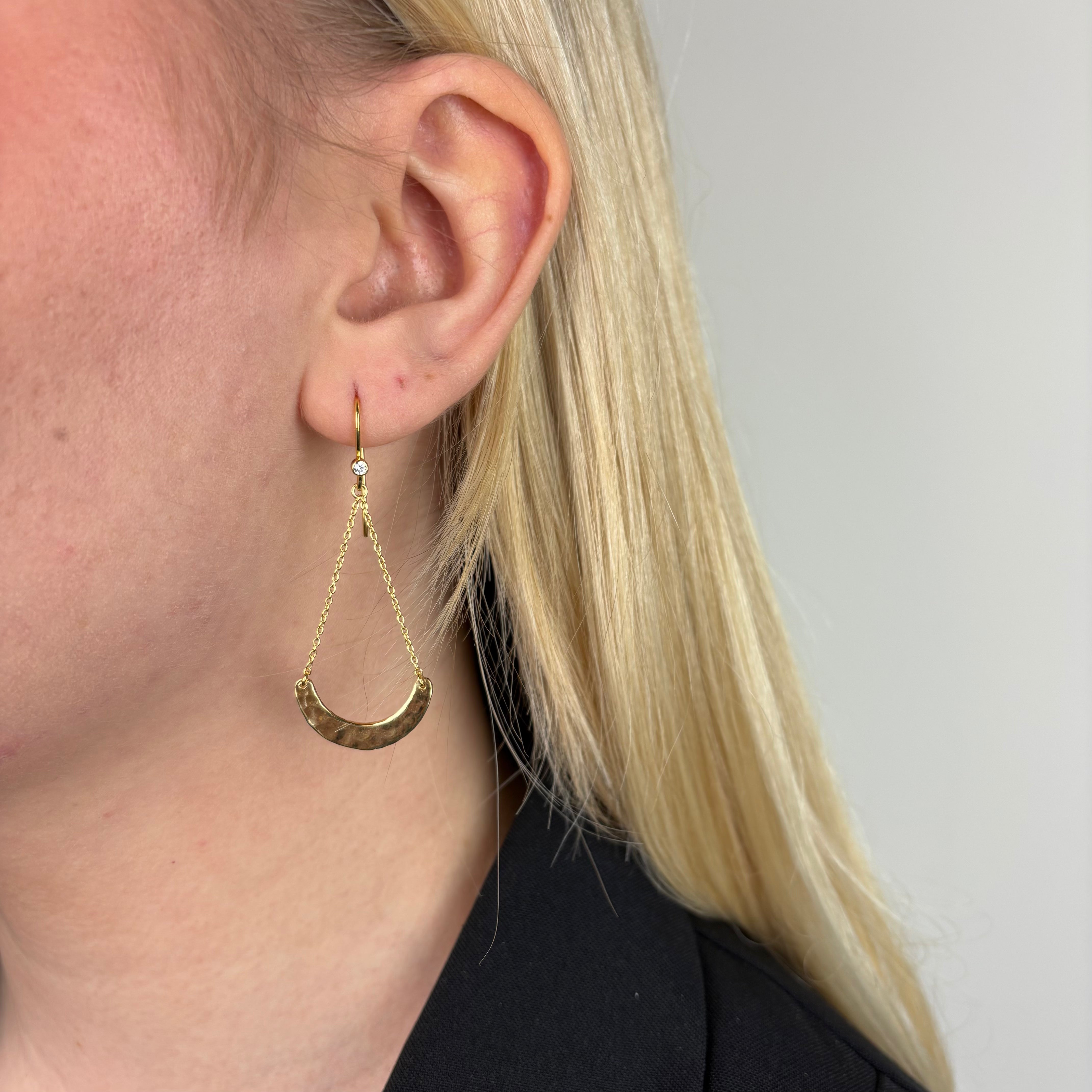 Det her smykke er til dig, der ikke gider pynt for pyntens skyld. Øreringene hænger i to fine kæder, med en hamret, poleret halvcirkel der fanger lyset og giver bevægelse - minimalistisk, men med attitude og med en skinnende Zirconia.