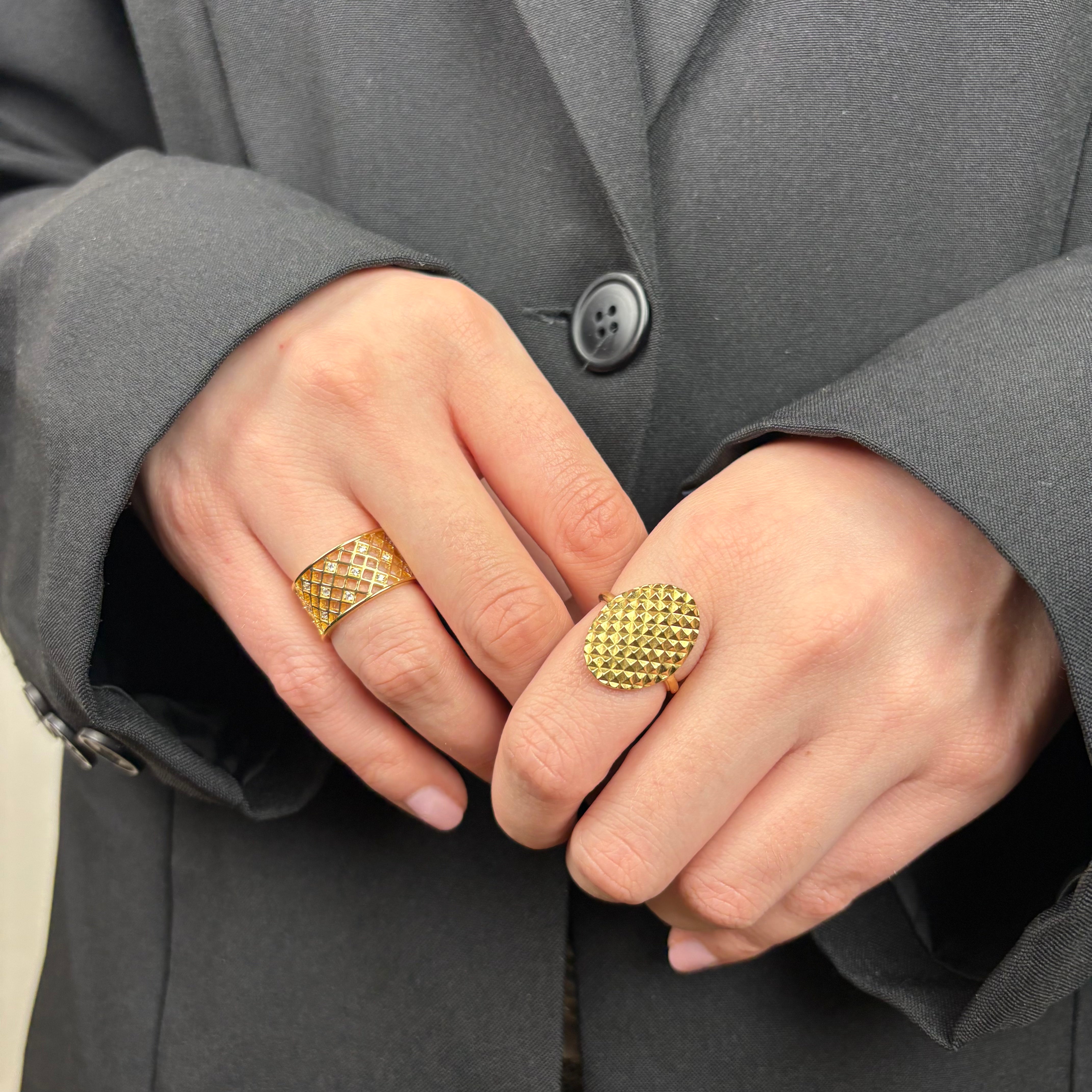 Designet er skrapt og grafisk, men stadig let og elegant - en moderne fortolkning af et tidsløst mønster. Ringen udstråler både stil og personlighed.